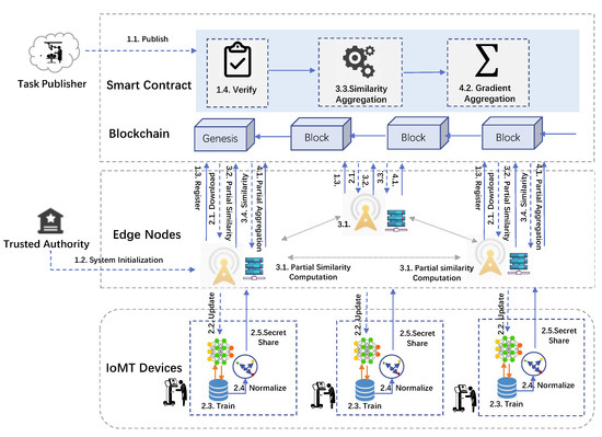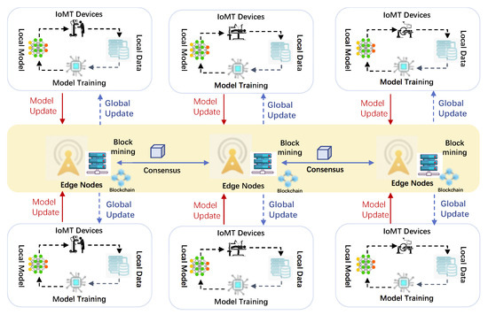 Figure 4 depicts our proposed framework, which consists of four primary components: 1. Task Publisher; 2. Trusted Authority; 3. IoMT Edge Nodes; and 4. IoMT Devices, supported by 5. blockchain Infrastructure. The roles and interactions of these components are elaborated below.