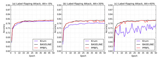 - Robustness of Local and Global Model: In our scenario, we consider adversaries that perform poisoning attacks on the IoMT device’s datasets. Such a poisoning attack will lead to a faulty local model and a poisoned global model. Our PPBFL utilizes the cosine similarity to detect and eliminate poisoned local model updates during the aggregation process. Judging from the experimental results, our PPBFL can effectively mitigate the influence of poisoned local model updates. From this result, our PPBFL can guarantee the robustness of both the local and global models.