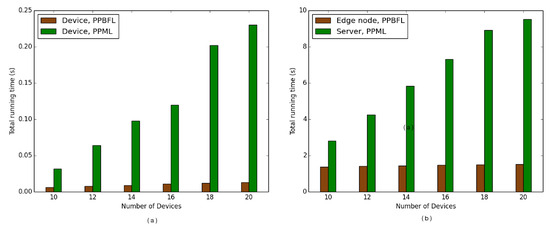 Computation comparison between PPBFL and PPML. (a) Device side. (b) Server side.