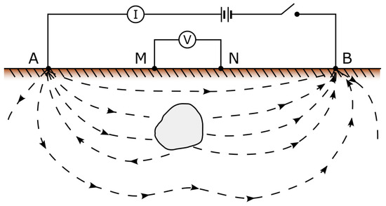 Electrical and seismic exploration are two widely used geophysical methods in geological surveys [4]. Electrical exploration technology is a geophysical method used to detect geological structures, locate minerals, and find water based on the differences in resistivity and polarization characteristics of soil and rock [5]. It has many advantages, such as a high resolution and accurate results. Common electrical exploration methods include the natural potential method, resistivity method, induced polarization method, and controlled-source audio-frequency magnetotellurics (CSAMT) method [6]. The resistivity method is used to detect underground anomalies based on the differences in resistivity of subsurface materials [7]. As shown in Figure 1, the instrument supplies power to the earth through electrodes , creating a stable electric field underground, while measuring the supply current I. The instrument measures the potential difference between two points on the surface using electrodes , and calculates the apparent resistivity value (, in units of ) at the midpoint between electrodes M and N using the formula .