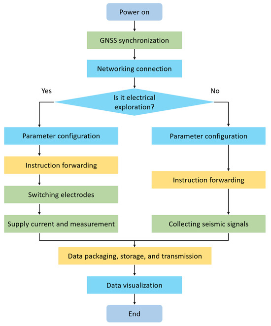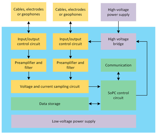 In summary, traditional geophysical instruments have limitations such as low power, single functionality, few channels, fixed arrangement measurements, and slow measurement speed. To address the limitation of single functionality, Qiao et al. proposed a hybrid seismic–electrical acquisition station based on cloud technology and the green IoT [26], but this acquisition system still faces issues of low power and limited number of channels. Multi-method combined exploration has become a research highlights, but the development of related combined acquisition instruments has been slow. Therefore, developing a seismic–electrical combined acquisition system for geophysical exploration has significant scientific importance. With the increase in detection depth, improvement in observation accuracy, and diversification of observation methods, seismic and electrical combined acquisition technology has broad development prospects. Multi-channel, multi-functional, multi-parameter, high-power, and wide-range capabilities will become a trend in the development of geophysical instruments [27].