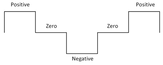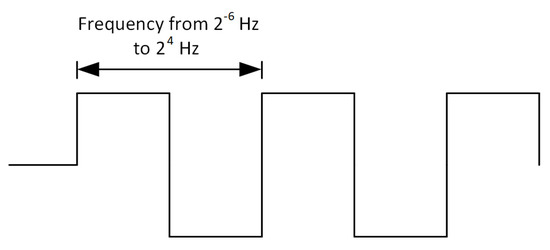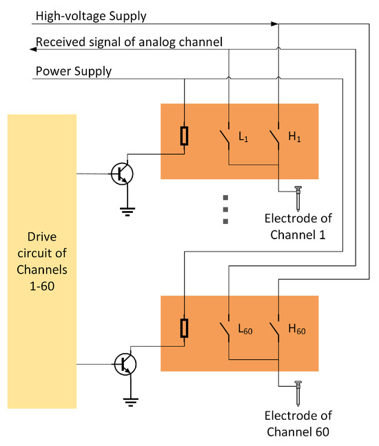 The channel input/output control circuit is shown in Figure 3. Each channel has two relays controlled by the MC1413 chip. The MC1413 operates at a high voltage and current, with the ability to sink a current of up to 500 mA and withstand a voltage of 50 V in the off state. It can also operate in parallel with high-load currents during output [28]. One of the relays, H, is used to control the power supply. Relay H is responsible for controlling the high-voltage power supply. After selecting a particular electrode, the MC1413 drives relay H to connect the electrode to the high-voltage power supply, allowing a high-voltage current to flow through the electrode to the ground. Relay L is used to control the measurement. After selecting a specific electrode, the MC1413 drives relay L to connect the electrode to the analog channel circuit, where the ADC in the analog channel measures the potential at the electrode contact point. Relays H and L will not be activated simultaneously, as this would cause a short circuit. The high-voltage power supply is adjustable, with a maximum voltage of 2000 V. The high-voltage power supply is used to input a high-voltage current into the ground to measure the apparent resistivity, polarization rate, phase difference, complex resistivity, and other data. As shown in Figure 4, during the time-domain electrical exploration process, the bridge converts the DC voltage into alternating waveforms of positive, zero, and negative voltages. As shown in Figure 5, during frequency-domain electrical exploration, the high-voltage bridge converts the DC voltage into square waveforms with frequencies ranging from Hz to Hz. Additionally, the high-voltage bridge integrates protections against over-voltage, over-current, and other faults to ensure operator safety.
