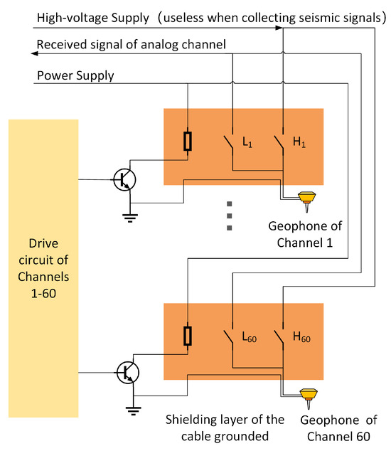 When the instrument is used for seismic data acquisition (as shown in Figure 6), each channel’s signal wire is connected to one output terminal of the geophone, while the shielding layer is connected to the other terminal. In addition, the shielding layer is grounded at the instrument end. The seismic geophone used with the instrument has a coil resistance of 1800 , a natural frequency of 10 Hz, and a sensitivity of 85.8 V/m/s. After selecting a particular channel, the MC1413 drives the relay L to connect the corresponding seismic geophone output to the analog channel circuit. The ADC in the analog channel then measures the output voltage waveform of the seismic geophone.