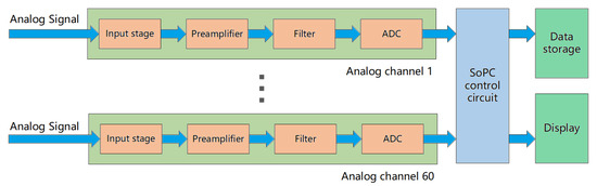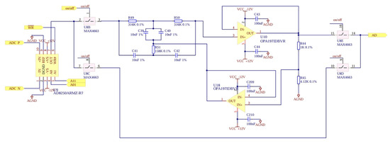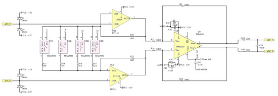 The analog channel filters and amplifies signals from geophones or electrodes, then digitizes them via an ADC chip before passing them to the main control unit. As shown in Figure 7, each channel is equipped with an independent amplification and filtering circuit, along with a dedicated 24-bit ADC. The system uses the AD7175 [29], a 16-channel, 24-bit, 250 ksps ADC featuring a 20 ms settling time and a true rail-to-rail buffer, which communicates with the main controller via SPI.