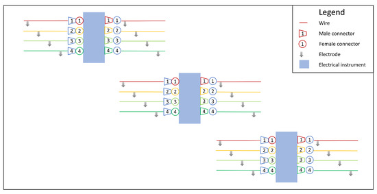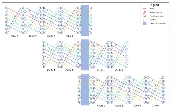 This paper uses an improved structure of cable, called the coverage cable, which is composed of several identical unit cables. Each unit cable has a male connector at one end, a female connector at the other, and several evenly spaced taps along its length to connect electrodes or geophones. Two cable units can be connected to each other through the male and female connectors. The core wires of the cable are offset and welded to the connectors in a regular pattern. If a group of cables consists of k unit cables, and each unit cable has m taps, the number of core wires in the cable is . The i-th pin of the unit cable’s female connector is connected to the -th pin of the male connector at the other end via the core wire. Taking an eight-core cable as an example, as shown in Figure 12, this cable group is composed of four unit cables, each with two taps. As shown in Figure 12, core wires of the same color are internally connected, linking the eight electrodes to pins 1 through 8 of the instrument’s female connector.