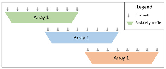 Resistivity profile coverage measurement. Each colored trapezoid represents a resistivity section from a separate acquisition with a different electrode configuration, together forming a full survey profile.