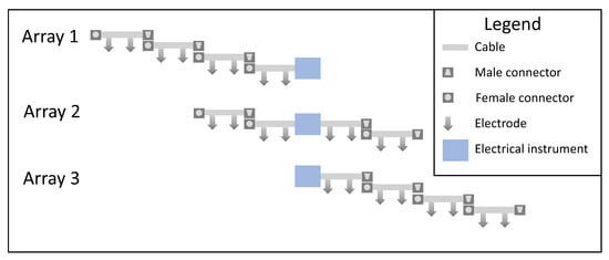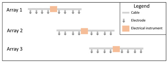 This instrument supports the rolling coverage measurement method during electrical or seismic exploration, which is realized by a new type of coverage cable. Taking high-density electrical exploration as an example, as shown in Figure 10, the commonly used centralized high-density resistivity instrument cables (referred to as centralized cables) have enough taps set along a single cable to serve as connection points for the electrodes [30]. If the profile length to be measured is greater than the cable length, the cable and electrodes must be moved to cover the profile (as shown in Figure 11). All electrodes must be disconnected from the cable before moving them. After relocating the electrodes, the cable must be repositioned and aligned with the new electrode positions before reconnecting. This process is inconvenient, time-consuming, and labor-intensive.