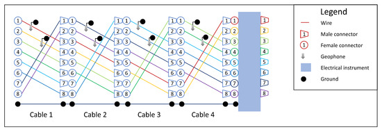 Diagram of the cable system for seismic measurements. Numbers indicate pin positions on the connector. Colored lines represent signal paths from geophones (gray arrows) to the instrument (blue box), and black dots denote grounding points.