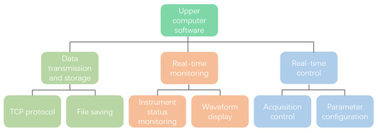 Developed in , the upper computer handles data reception, waveform display, and instrument control. is a strongly typed, object-oriented language widely used for professional development on Windows platforms [34]. The functional architecture of the upper computer software control system designed for this system is shown in Figure 17. The upper computer display interface is shown in Figure 18.