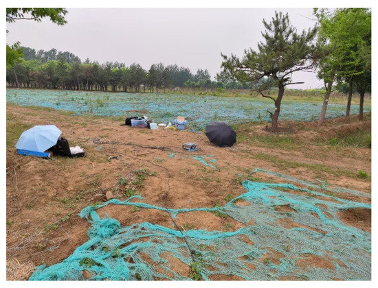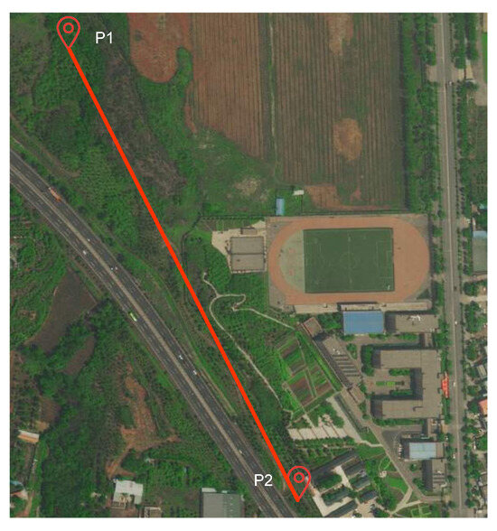 To verify the feasibility of the integrated measurement system, a field survey was carried out in Changping District, Beijing, China, with field photographs shown in Figure 20. The survey used a high-density electrical method with a Wenner array, which involves setting up all electrodes in advance and sequentially energizing different pairs. This automated technique is widely used in mineral exploration, geological hazard assessment, and related fields [35,36,37]. The Wenner array arranges the current electrodes A and B and the potential electrodes M and N at equal spacing in the sequence during power injection and measurement. By using coverage cables instead of centralized ones, the time required for instrument relocation is significantly reduced. As shown in Figure 21, the survey line was investigated, starting at point (40.242054° N, 116.159484° E) and ending at point (40.237318° N, 116.16251° E), with a total length of 580 m.
