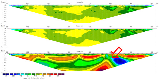 The survey results of the survey line are shown in Figure 22. The three subplots from top to bottom display the measured apparent resistivity pseudo-section, the calculated apparent resistivity pseudo-section, and the inverted resistivity model. A least-squares inversion method was applied to derive the subsurface resistivity model from the measured data. The inverted resistivity model reveals a region of lower resistivity at the deeper part of the line, around the 400 m coordinate.