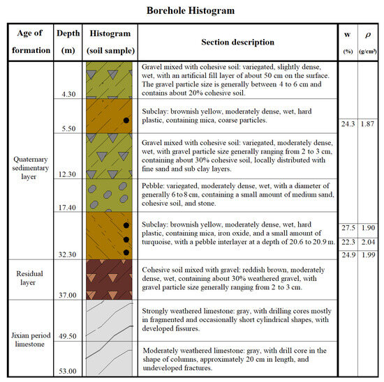 Figure 23 shows the core sampling analysis at the 400 m point of the survey line. The ’w’ column represents soil moisture content, while the ’’ column indicates soil density. The surface layer, up to 50 cm in depth, consists of artificial fill soil with gravel particles typically ranging from 4 to 6 cm in diameter and approximately 20% clay content. The layer extending from the surface to a depth of 4.3 m consists of moderately dense variegated gravel mixed with clay. The layer between 4.3 and 5.5 m in depth consists of yellow-brown, moist subclay containing mica and coarse particles. The section from 5.5 to 12.3 m in depth is composed of moist variegated gravel mixed with clay, with gravel particle diameters typically ranging from 2 to 3 cm, approximately 30% clay, and locally distributed fine sand and subclay layers. The layer between 12.3 and 17.4 m in depth consists of variegated cobbles, with diameters typically ranging from 6 to 8 cm, and containing small amounts of medium sand, clay, and gravel. The section from 17.4 to 32.3 m in depth is composed of yellow–brown, moist subclay containing mica, iron oxide, and a small amount of gingerstone, with a pebble interlayer present between 20.6 and 20.9 m. The section from 32.3 to 37 m in depth consists of red–brown, moist clay soil mixed with gravel, containing approximately 30% weathered gravel, with gravel particle diameters typically ranging from 2 to 3 cm. The section from 37 to 49.5 m in depth is composed of gray, strongly weathered limestone, with drill core samples predominantly broken and blocky, and occasionally cylindrical. The section from 49.5 to 53 m in depth consists of gray, moderately weathered limestone, with drill core samples in columnar form, each approximately 20 cm in length. The core sampling results align with the low resistivity observed in the electrical inversion of the underground structure. Specifically, the section from 32.3 to 37 m, with a density of 1.99 g/cm3 and 24.9% moisture content, matches the low resistivity feature in the inverted model (red arrow in Figure 22). This demonstrates the system’s effectiveness and efficiency in surveying underground structures.