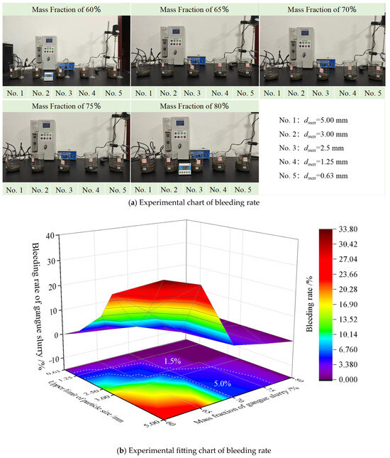 The upper limits of the gangue particle size controlled in this experiment were −5 mm, −3 mm, −2.5 mm, −1.25 mm, and −0.63 mm, respectively. The slurry concentrations were set to 60%, 65%, 70%, 75%, and 80%, respectively. A total of 25 sets of experiments were conducted, and the moisture content of the gangue under different gradations was measured before the experiment. The overall plan of this investigation was to keep the total amount of 200 g of gangue unchanged and to prepare 60%, 65%, 70%, 75%, and 80% gangue slurries by controlling the different water amounts in sequence. Then, the gangue slurry was allowed to stand still, and the water released from the surface of the gangue slurry was sucked out using a rubber-tipped dropper at different times. After 90 min, the mass of accumulated water released was calculated [26,27,28]. Finally, the bleeding rate of the gangue slurry was calculated according to Formula (1), and the data were processed, as shown in Table 2 and Figure 3.