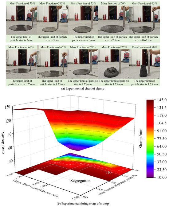Slump refers to the difference between the height of the test bucket and the maximum height of the filled slurry after the collapse and is the simplest method to measure the flow performance of a slurry [30,31]. In this experiment, a standard slump cylinder with an upper diameter of 50 mm, a lower diameter of 100 mm, and a height of 150 mm was used to scale the slump of the different gangue grades and slurry concentrations. Twenty-five sets of slump data were measured, as shown in Table 3 and Figure 4.