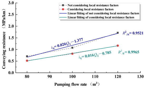 Combining the above calculation with Table 2, the relationship between the pumping flow rate and conveying resistance was obtained under two conditions: considering local resistance and not considering local resistance, as shown in Figure 7. As shown in the figure, as the pumping flow rate increased, the conveying resistance also increased, and the influence of the bent pipe sections on the conveying resistance also increased; when the pumping flow rate was the same, the measured and calculated conveying resistances were higher than the actual designating resistance, and as the pumping flow rate increased, the difference rate between the estimated and actual communicating resistance increased. Compared with the case of not considering local frictional losses, the fitting degree of the pumping flow and conveying resistance obtained by considering local frictional losses was higher.