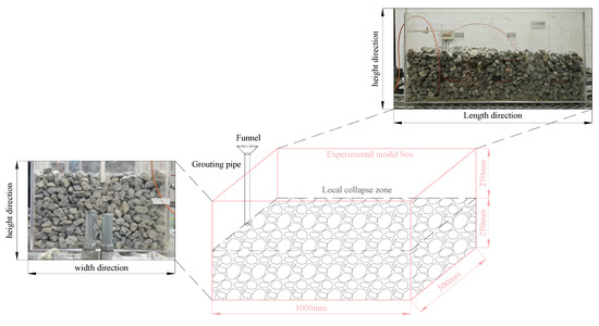 A test model box with a length, width, and height of 1.0 m, 0.5 m, and 0.5 m, respectively, was made using acrylic plate. In the test model box, different particle size fragments were placed to simulate the local state of the collapse zone with a porosity of 0.3. The height, width, and length of the collapse zone formed by accumulation were 0.25 m, 0.5 m, and 1.0 m, respectively. A PVC pipe with an inner diameter of 50 mm was placed in the middle of one side of the test model box to simulate the grouting pipe, as shown in Figure 8.