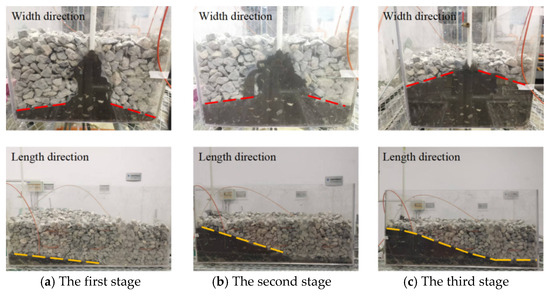 The first stage was the free flow stage: the gangue slurry began to flow downward along the gap between the rock blocks from the slurry outlet and then began to diffuse around the gap between the rock blocks after the slurry reached the bottom of the experimental model box. The overall diffusion range was conical, as shown in Figure 9a.