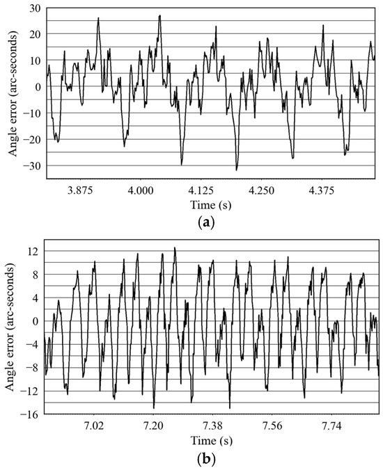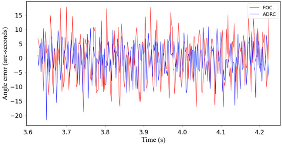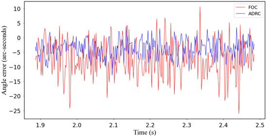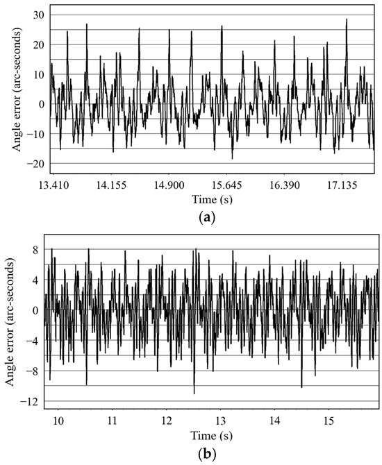 Figure 14 shows the angle error waveform exhibited by the second joint of the robot under the condition that the robot trajectory running speed is set to 50 mm/s. Specifically, when using the vector control algorithm, the fluctuation range of is plus or minus 25 arcseconds, as shown in Figure 14a. After applying the ADRC algorithm, the fluctuation range of was significantly reduced to plus or minus 9 arcseconds, as shown in Figure 14b. This comparison result demonstrates the superiority of the ADRC algorithm in reducing angle error fluctuations.