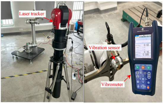 Figure 11 shows the installation of a laser target ball on the end of the machine, and the use of a laser tracker to collect trajectory velocity fluctuations. At the same time, a vibrometer was installed at the end of the robot to record vibration data.