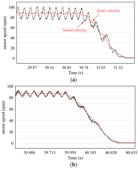 Figure 13 shows the PMSM velocity waveform of the second joint when the robot trajectory speed is set to 50 mm/s. The red line in the waveform corresponds to the speed setting value of the PMSM, while the green line reflects the actual speed value of the PMSM. When the robot performs linear motion at a speed of 50 mm/s, if the vector control algorithm is used, the speed fluctuation range of the PMSM is plus or minus 11 revolutions per minute, as shown in Figure 13a. After applying the ADRC algorithm, the speed fluctuation significantly decreased to plus or minus 5 revolutions per minute, as shown in Figure 13b.