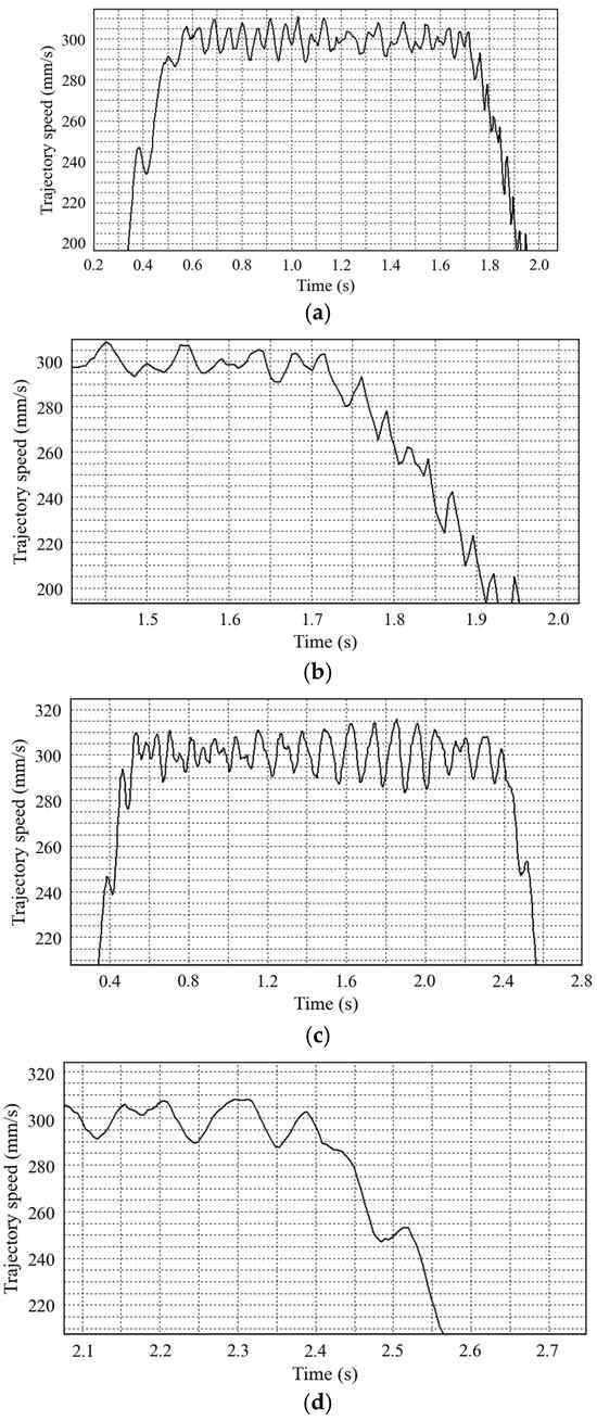 Velocity waveform of 300 mm/s trajectory. (a) Robot trajectory waveform using vector control algorithm. (b) Local diagram of trajectory waveform using vector control algorithm. (c) Robot trajectory waveform using ADRC algorithm. (d) Local waveform of trajectory using ADRC algorithm.