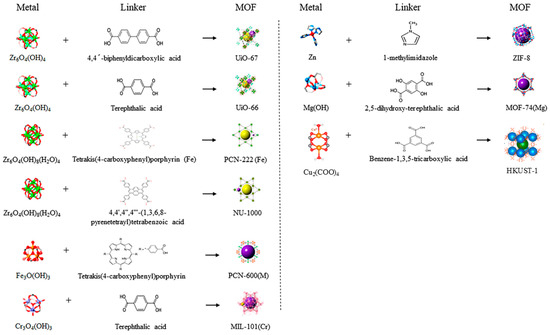 MOFs are hybrid inorganic-organic open frameworks with potential high porosity. More specifically, they are built through the combination of organic linkers and inorganic building blocks, which can either be metal ions or polynuclear metal clusters, also described as secondary building units (SBUs) [24,25,26]. The combination of these building blocks towards the formation of a porous framework is governed by reticular chemistry principles [27,28], which have been proven to be a powerful tool for the design and synthesis of materials with specific structural characteristics and installed functionality to enhance their interactions with specific chemical moieties and improve their performance in targeted applications.