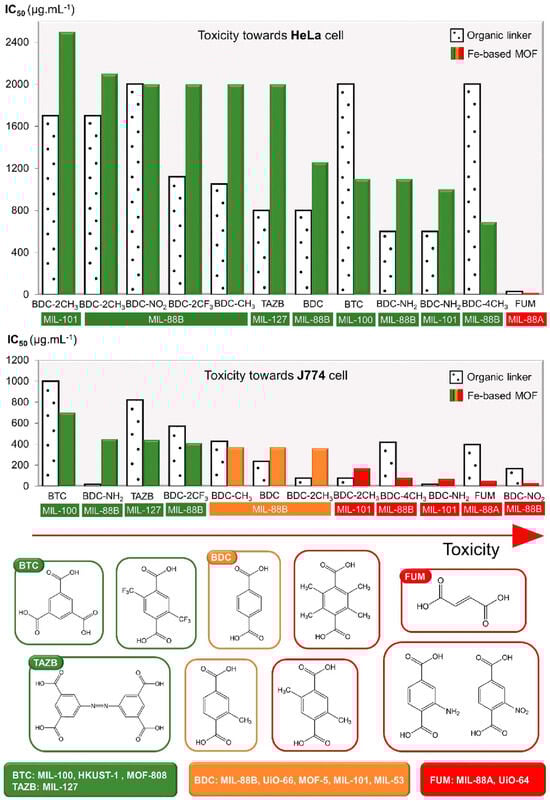 Toxicity of organic ligands and corresponding MOFs based on Fe, based on IC50 data [110,114] Reprinted with permission from Ref. [110] ©Elsevier 2023.