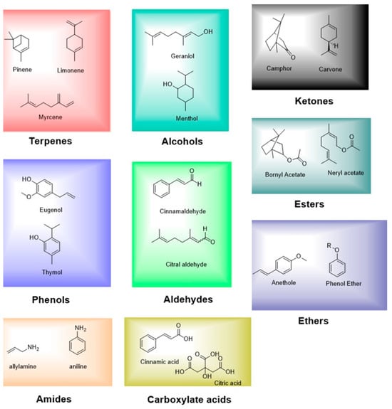 More specifically, EOs are secondary metabolites produced by various plants in order to survive under extreme environmental conditions, such as high or low temperatures and non-optimal pH levels. These oils are rich in bioactive low molecular weight compounds, such as terpenes, aldehydes, ketones, esters, oxides, and alcohols (Figure 3) [113]. The chemical composition of EOs varies significantly across plant families and even within the same species, according to external environmental factors [116].