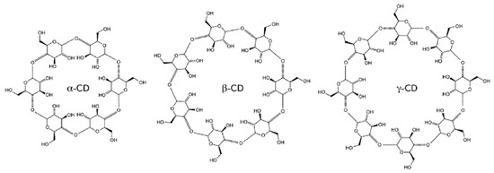 α-CD (6 glucose units and cavity size, 4.7–5.3 Å), β-CD (7 glucose units and cavity size, 6.0–6.5 Å), γ-CD (8 glucose units and cavity size, 7.5–8.3 Å) (CD refers to cyclodextrin) Reprinted with permission from Ref. [163]. © Elsevier 2022.