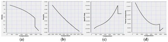 (a). Temperature-dependent density (Kelvin, g/cm3) (b). Temperature-dependent viscosity (Kelvin, g/cm·s) (c). Temperature-dependent specific heat (Kelvin, 10−7 J/g·K) (d). Temperature-dependent thermal conductivity (Kelvin, 10−7 W/cm·K).