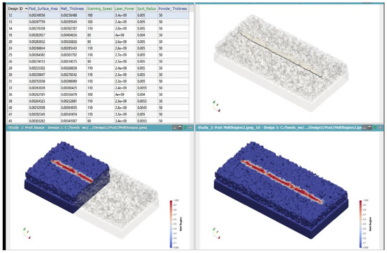 When multiple objectives are defined in the optimization process, the interactions between parameters must be carefully evaluated. As a result of the analysis, the optimal parameter combination was found in design 29. This design provides significant improvements in surface area and micro-porosity; although it does not achieve the targeted value for melt pool depth, it was determined to be the most efficient design overall. These results demonstrate that the careful selection of process parameters directly affects the final material properties in additive manufacturing processes. The HEEDS optimization algorithm, based on the conducted analyses, identified the optimal 14 parameter combinations, which are presented in Figure 6. During the optimization process, process parameters that minimize porosity while enabling the formation of a stable and homogeneous melt pool were determined. The simulations conducted allowed for a detailed analysis of the effects of parameters such as laser power, scan speed, laser spot diameter, and layer thickness on melt pool formation.