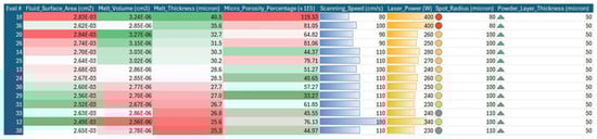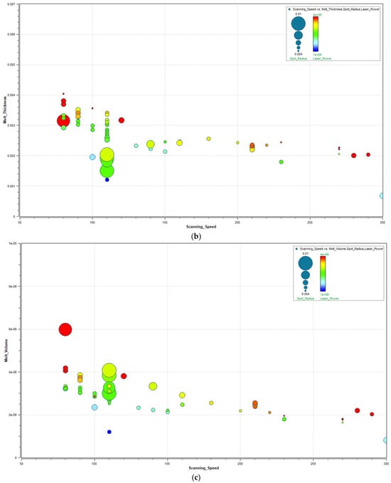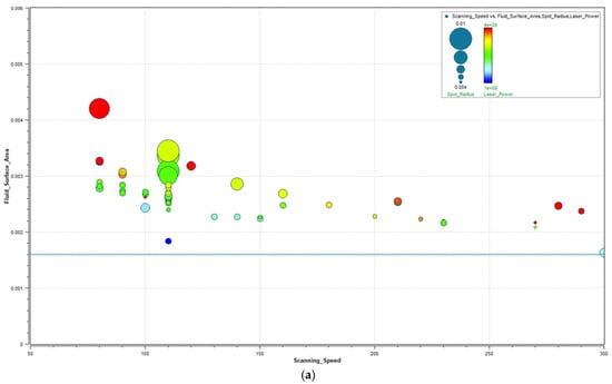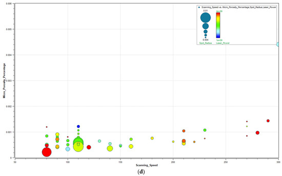 Figure 5a–d presents the data obtained from 247 simulations conducted by varying scanning speed, spot radius, layer thickness (50 µm), and laser power. Within this analysis, critical parameters such as flow surface area, melt depth, melt volume, micro-porosity percentage, and laser absorption level (80%) were examined in detail. The simulation software represents dimensions such as track width as radius in graphical outputs. However, in this study, descriptions are provided in terms of diameter. This is because the input parameters for the SLM machine are defined in diameter.