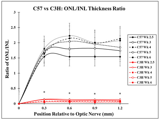 Difference in ONL/INL ratios between C57 and C3H mice from postnatal week 2.5 to postnatal week 6. The ONL/INL ratio was calculated by measuring the depth of each layer in fields surrounding the optic nerve and dividing the ONL by the INL. This ratio was significantly larger for C57 mice than the C3H mice for each time point measured along the retina. The difference between the C57 and C3H ONL/INL ratio increased as time progressed from week 2.5 to week 6. The C3H mice showed a significant decrease in ONL/INL ratios between weeks 2.5 and 3, as well as between weeks 3 and 4 (p < 0.05). A significant difference was found for ONL/INL ratios of all C3H time point groups compared to their C57 counterparts at each retinal location (* indicates p ≤ 0.05).
