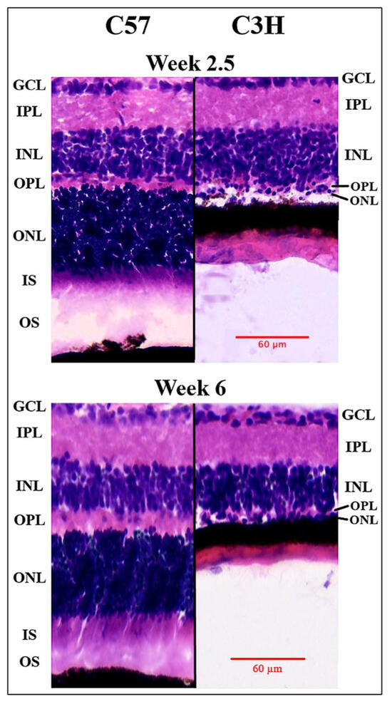 Comparison of C57 and C3H retinal layers at week 2.5 and week 6. Eye sections from the mid-periphery of each animal’s retina, stained with H&E, show the retinal layers, as indicated by the text above. Significantly reduced OPL and ONL can be seen in the C3H sections (right) when compared to their C57 counterparts (left).