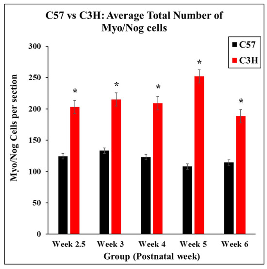 Number of Myo/Nog cells in the retinas of C57 and C3H mice. Total Myo/Nog cells in all retinal layers were counted and averaged for each time point. Myo/Nog cells were significantly more numerous at all time points in C3H mice compared to C57 mice (* indicates p ≤ 0.05).