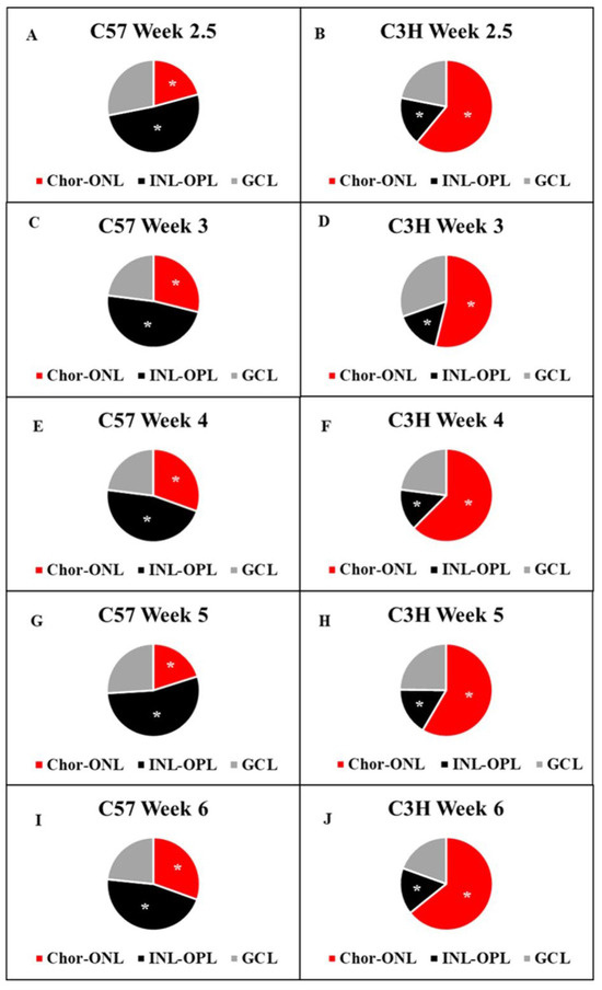 Distribution of Myo/Nog cells throughout the retinal layers at different time points of C57 and C3H mice. (A,C,E,G,I) represent C57 mice in which the majority of Myo/Nog cells are in the INL-OPL layers of the retina. (B,D,F,H,J) represent C3H mice with the majority of Myo/Nog cells in the ONL and choroid. There was no statistical difference between the distribution of Myo/Nog cells in the GCL between the C3H and C57 mice. The distributions of Myo/Nog cells found in the choroid–ONL and INL-OPL layers of the retina were statistically different in C3H mice compared to C57 mice (* indicates p ≤ 0.05).
