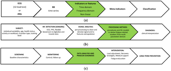 Block schemes. (a) From ECG to classification for clinical interpretation in a theoretical framework; (b) the multi-stage pipeline with the main sources of variability and noise: limitations in the whole HRV data processing method can be found in these steps (subject, sensor, analysis, method, etc.); (c) the timeline of possible healthcare applicative procedures. The sections in green focus on the main research question.