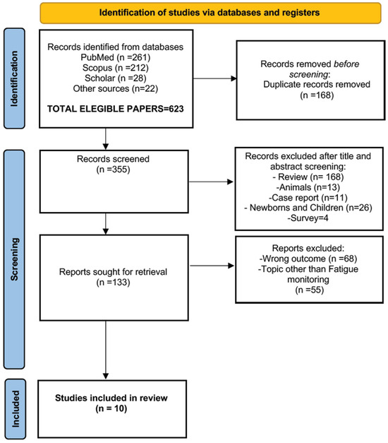 A flow diagram of the literature search, according to the PRISMA criteria (http://www.prisma-statement.org/, accessed on 15 January 2025), with the steps followed in the manuscript selection procedure. After the application of the selection criteria, the initial 623 manuscripts were reduced to 10.