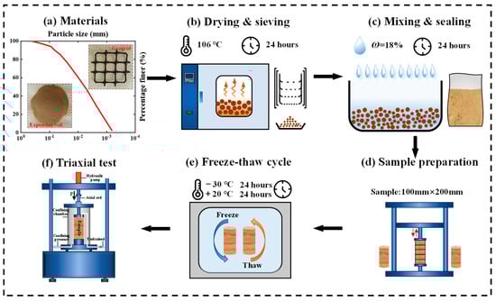 The world’s permafrost accounts for 24 percent of the land area and is widely distributed, exceeding 50 percent in some countries, such as Norway, Arctic islands, Greenland, and Antarctica, where it is particularly extensive [1]. In China, the permafrost distribution area is large, accounting for about 22% of the country’s land area, and the seasonal permafrost area accounts for about 48%. Under long-term F-T conditions, geotechnical engineering produces irreversible and persistent damage accumulation and leads to numerous engineering problems [2,3,4], for example, slope instability, severe deformation of the roadbed, and damage to retaining walls. Many studies have shown that F-T cycles change the pore structure characteristics of soils, and soil strength, modulus of elasticity, cohesion, and angle of internal friction decrease significantly with an increment of F-T cycles [5,6,7,8,9,10,11].