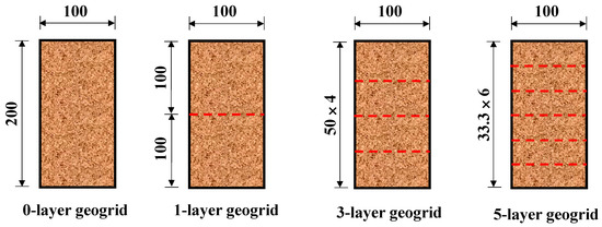 The cylindrical specimens were 100 mm in diameter and 200 mm in height. The geogrid reinforcement layers were embedded horizontally in different layer configurations (0, 1, 3, and 5 layers), and the spatial layout is shown in Figure 2. Prior to sample preparation, the expansive soil was dried at 105 °C for 24 h and then sprayed with distilled water through a gradual process in order to achieve a predetermined moisture content. During the spraying process, the water–soil mixture was stirred and homogenized to prevent localized moisture concentration. The mixed material was then sealed in a humidified container for 24 h of equilibration to ensure uniform moisture distribution. Final compaction was carried out by layering in layers and surface planning between layers to enhance structural integrity, as shown in Figure 1b–d.