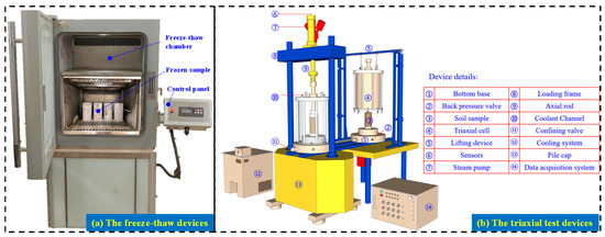 This test adopts F-T cycle test chamber (TMS9018-250, Zhejiang Tomos Technology Co., LTD, Zhejiang, China) to carry out the F-T cycle of the specimen; the controllable temperature range is from −40 °C to +60 °C, and the temperature accuracy is ±1 °C. According to previous scholars’ freezing and thawing cycle setting temperature [33,34], in order to ensure that the specimen is completely frozen, and considering the large size of the specimen in this test, specimens were firstly frozen at −30 °C for 24 h and then allowed to thaw at 20 °C for 24 h. as shown in Figure 1e. All of these stages were considered as one cycle and sealed with plastic wrap and tape to prevent moisture loss. It can be seen that the maximum number of F-T cycles was about 10 times in previous test, and soil strength reaches a stable state after 5–7 F-T cycles [35,36]. Therefore, the maximum number of F-T cycles of 10 times was chosen in this test, which was carried out with 0, 1, 3, 6, and 10 F-T cycles. F-T cycle test devices are shown in Figure 3a.