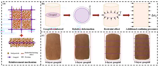 (a) Reinforcement mechanism; (b) diagram of specimen reinforcement effect; (c) shear deformation of reinforced soil with different layers of geogrids.