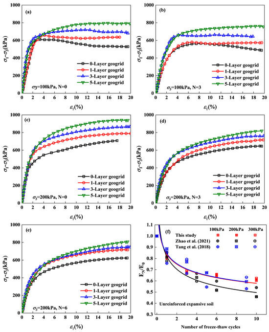 Stress–strain curves of the unreinforced and reinforced specimens, (a) = 100 kPa, N = 0; (b) = 100 kPa, N = 3; (c) = 200 kPa, N = 0; (d) = 200 kPa, N = 3; (e) = 200 kPa, N = 6; (f) correlation between elastic modulus and freeze–thaw cycle [9,39].