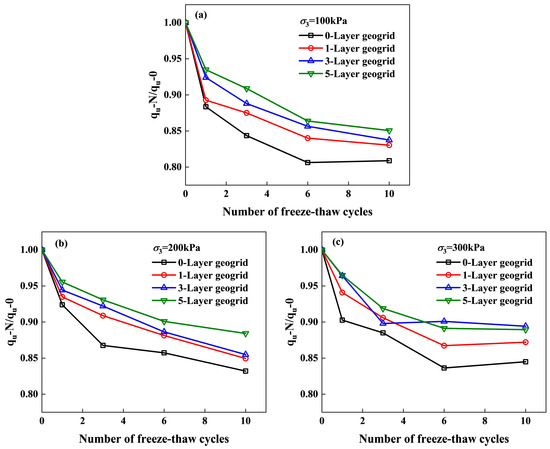 Figure 6 illustrates the normalized shear strength evolution under F-T cycles, where the dimensionless parameter represents the strength ratio between F-T-exposed specimens and their untreated counterparts sharing identical geosynthetic reinforcement configurations. As shown in Figure 6: (1) The normalized shear strength exhibited a decay trend with F-T cycles, the decrease was obvious in 1–3 F-T cycles, and smaller and stabilized in 6–10 F-T cycles, which indicated that the internal structural reorganization of the specimen reached a dynamic equilibrium after 6 F-T cycles. These are in good agreement with the findings of [35,36]. (2) The higher the confining pressure, the more obvious the effect of reinforcement. Take six F-T cycle and three-layer geogrid reinforced specimens as an example, with 100 kPa confining pressure, the shear strength of the three-layer geogrid reinforced specimen decreased by 15.1%, with 300 kPa confining pressure, it decreased by 10%. (3) Compared with the plain specimens, the geogrid-reinforced specimens were more stable under the influence of F-T cycles. When the confining pressure was 200 kPa, the shear strength of plain specimens decreased linearly with the number of F-T cycles, while the shear strength of geogrid-reinforced specimens slowed down after three F-T cycles and increased slightly after six freeze–thaw cycles.