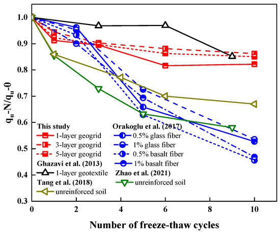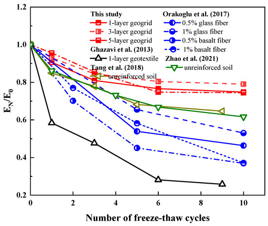 Figure 7 shows the normalized shear strength () in the present paper compared to the previous studies [9,34,39,43]. is the shear strength after F-T cycles. is the shear strength before F-T cycles. It gives the variation of normalized shear strength of reinforced soil for different reinforcing materials under the F-T cycles, including geogrids, geotextiles, glass fibers, and basalt fibers. Overall, the normalized shear strength of the reinforced soils decreased with the increasing F-T cycles, but there were significant differences in the magnitude of the decrease. The geogrid-reinforced soil showed a stable behavior with the smallest decrease, a larger decrease after the one F-T cycle, a significant slowdown after the three and six F-T cycles, and a slight upward trend after the ten F-T cycles. Geotextile also shows a better reinforcing effect; it has many small holes; the tendon soil contact area is large and resulting in high friction. In addition, small holes are more obvious to embed a locking effect in the fine-grained soil. Our future works will continue to investigate the reinforced effect of grid aperture (bi-directional geogrids) and cross rib spacing (uni-directional geogrids) under F-T conditions. The shear strength of the geogrid-reinforced specimen was reduced by 14.6% after the six F-T cycles and 15.5% after the ten F-T cycles. However, the normalized shear strength of fiber-reinforced soils decreased significantly with increasing number of F-T cycles. Also, the shear strength of the glass-fiber-reinforced specimen was reduced by 30.75% after the five F-T cycles; this decreasing trend was 33.8% for the basalt-fiber-reinforced specimen, 46.9%, and 53.8% after the 10 F-T cycles. It is obvious that the reinforcement effect of geogrids or geotextiles is significantly better than that of fibers (glass fibers, basalt fibers) in F-T conditions. They have different mechanisms of reinforcement influence: for geogrids or geotextiles, friction and embedded locking effect indirectly provide additional pressure, and limit shear deformation to achieve the reinforcement effect; for fibers, mainly due to friction and local space constraints [44].