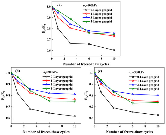 Variation of normalized elastic modulus versus F-T cycles in this study, (a) = 100 kPa; (b) = 200 kPa; (c) = 300 kPa.