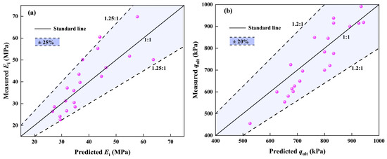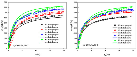The deviatoric stress–strain curve of GRES subjected to F-T cycles was calculated by Equation (10), as shown in Figure 12. Compared to the experimental data, the predicted curves were well fitted to the test values, and the stress–strain deviations at the peak points were within 5.1%. The Duncan–Zhang modified model can be used as a prediction formula for the stress–strain characteristics of GRES under freeze–thaw cycling conditions. The research results can provide important theoretical support for the practical engineering design of GRES in cold regions.