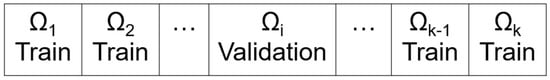 The basis of cross-validation is to use all the N observations in the sample Ω to validate the classification model, calculating its performance on all the available data. Then, the k-fold cross-validation method performs a random partition of the data into k subsets of equal size as shown in Figure 1, and uses each subset Ωj of N/k elements (test set) to validate a model that has been previously trained with the remaining N(1 − 1/k) observations of Ω\Ωj (train set).
