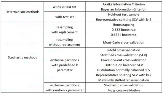Many methods have been investigated and proposed to select the combination of explanatory variables of the final model that maximizes predictive performance or minimizes model error. More simplistic methods like hold-out test samples make a deterministic estimation of error bias, while more advanced methods like cross-validation (CV) and bootstrapping (BTS) are stochastic in nature, considering both bias and variance of the model error [1,2,3,4,5,6,7,8]. The less computational requirements, better practicality, and good results of cross-validation techniques have made CV the most popular stochastic validation methodology for model error estimation, yielding a broad range of CV variants and benchmarking studies over the last decades [6,9,10,11].