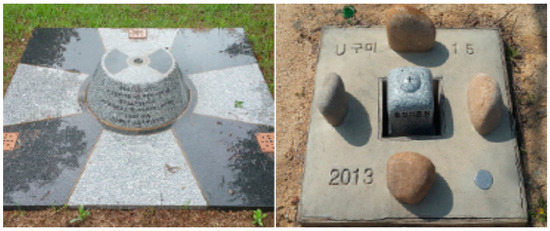 Shape of unified geodetic control point (UGCP). (Left) Design after 2014 (post-modernization type); (Right) Legacy design before 2014. U-구미 is the name of the UGCP, and the “통합기준점” inscribed at the center of the monument is the Korean name for UGCP.